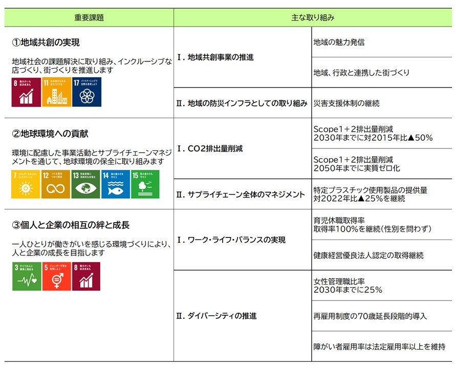 環境問題をはじめとする社会問題がより拡大、複雑化するなかで、地域とそこに暮らす人々に対する企業の社会的責任はますます大きくなり、「地域社会の発展」と「持続可能な社会の実現」に向けて、ESGを推進していくことは、企業として目指すべき姿であります。当社は、ESGをより一層推進していくため、「ESG方針」と取り組むべき3つの重要課題を定めました。