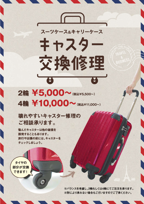 旅行や出張等のビジネスシーンで使う頻度が多いスーツケース&キャリーケースキャスターの修理を期間中、10%OFFいたします。