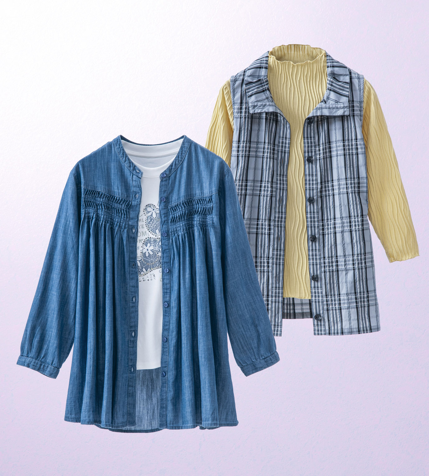 ◎3月26日(木)→30日(月)◎午前10時~午後6時◎5階 催会場※最終日は午後5時で終了。春もののベストやカットソーなどの商品をお値打ち価格で取り揃えました。(写真左)デニムブラウス 7,700円カットソー 3,300円(写真右)ベスト 7,700円カットソー 5,500円スプリングコート各種 7,700円から