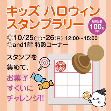●開催日時:10/25(土)・26(日) 12:00~15:00●場所:and1F特設コーナー●各日先着100名さまHoop・and館内4箇所に設置のスタンプを集めてお菓子すくいにチャレンジ!!さらに、仮装しているお子さまにはプチギフトをプレゼント!※数量限定。なくなり次第終了