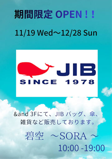 傘と雑貨のセレクトショップ「碧空~SORA~」のPOP UPショップが期間限定でオープンしました。◎期間:12/28(日)まで◎場所:3F特設会場(カメラのナニワ前)◎営業時間:10:00~19:00デザイン性と実用性を兼ね備えた選りすぐりの傘をスタッフがお気に入りの1本を見つけるお手伝いをします。クジラのマークが可愛い西宮発の「JIB」も販売しております。