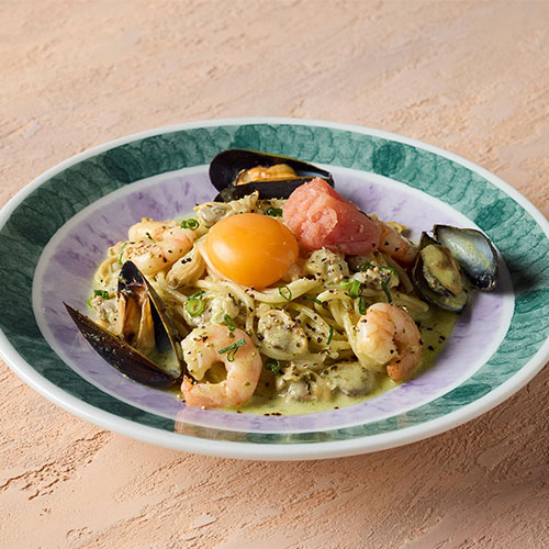 あさり、ムール貝、エビのジェノベーゼクリームソースに、たらこをトッピング。