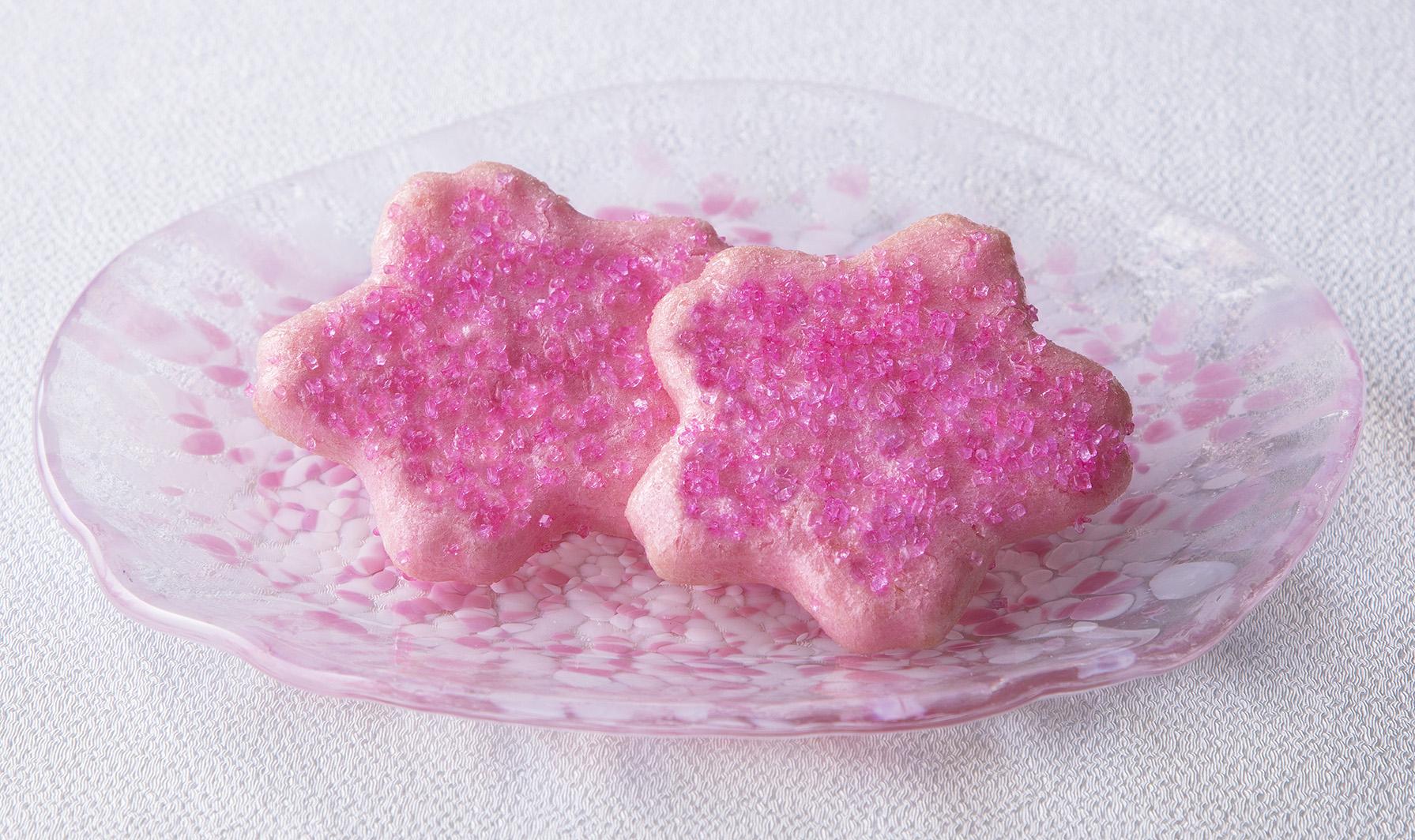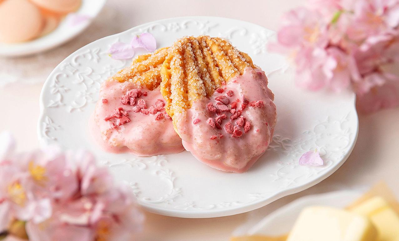 ざらめの食感広がる、風味豊かなさくさく生地。さくら味のチョコレートにさくらクランチをトッピング。