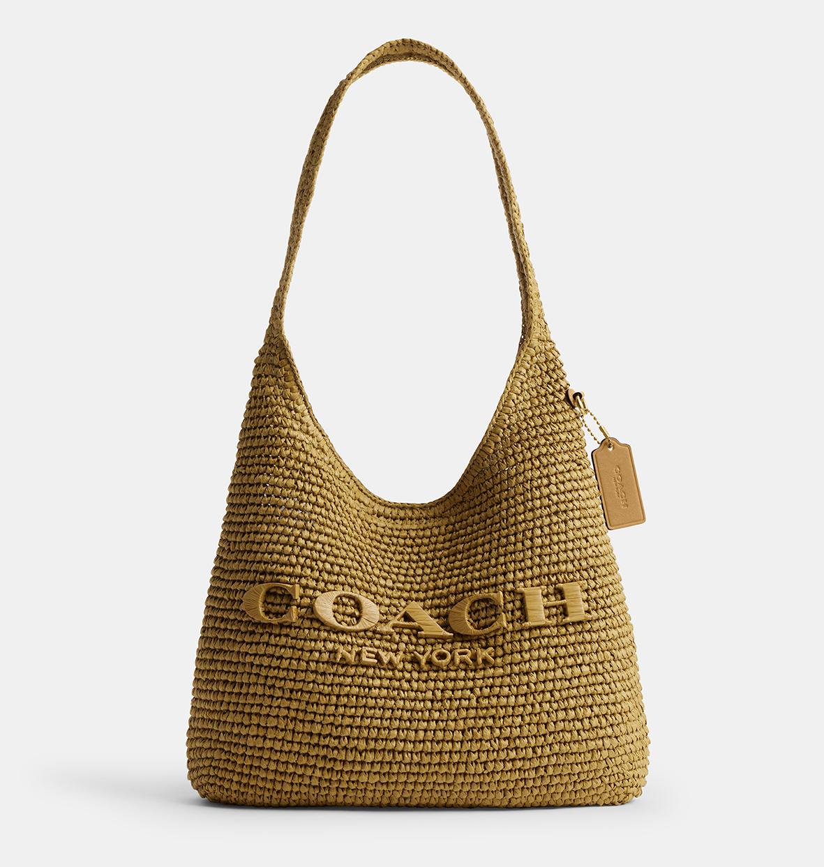 繊細に編んだストローにトーナル素材「COACH」ロゴが生み出すさりげない華やぎが、この季節ならではの心地よいムードを引き出します。