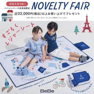 上記期間中、定価商品を税込22,000円以上お買いあげのベベメンバーズさまに、ベベオリジナル レジャーシートをプレゼントいたします。