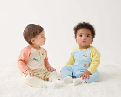 寝返り、おすわり、はいはい。動きが活発になってきた赤ちゃんには、動きやすくお着替えもしやすいカバーオールがおすすめ。