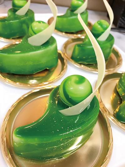濃厚なピスタチオムースに、グリオットチェリーのムースとラズベリーの甘酸っぱいジュレを閉じ込めました。