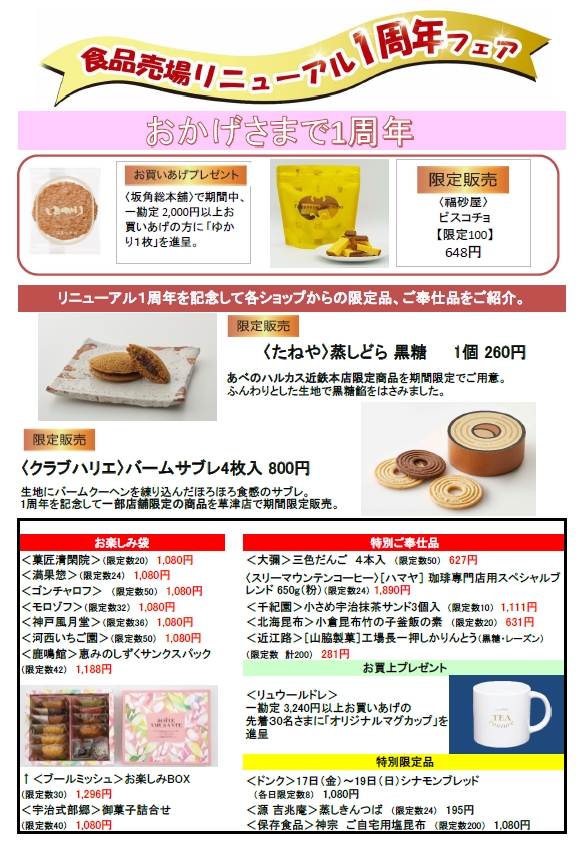 お菓子売場でもリニューアル1周年記念の限定品やお買いあげプレゼントをご用意しました。