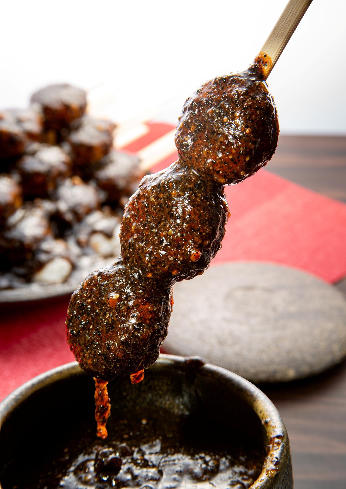 くるみ・えごま・ごまをたっぷり使用した、しょう油味噌たれの三つ玉五平餅です。