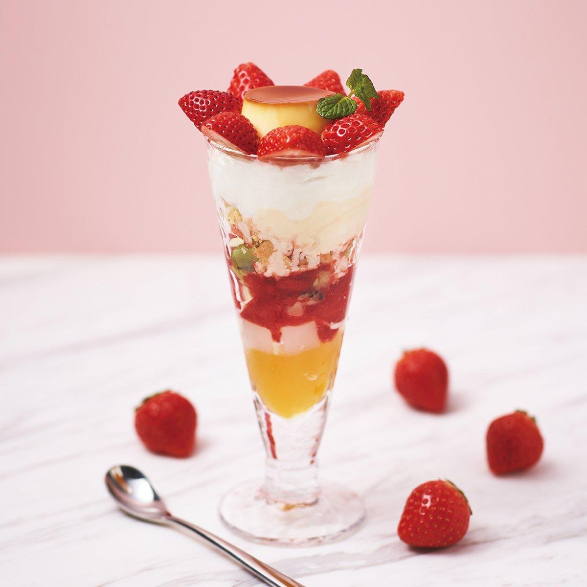カスタードプリン(ミニ)とバニラアイスクリーム、オレンジゼリーと旬のいちごで仕立てた期間限定パフェ。