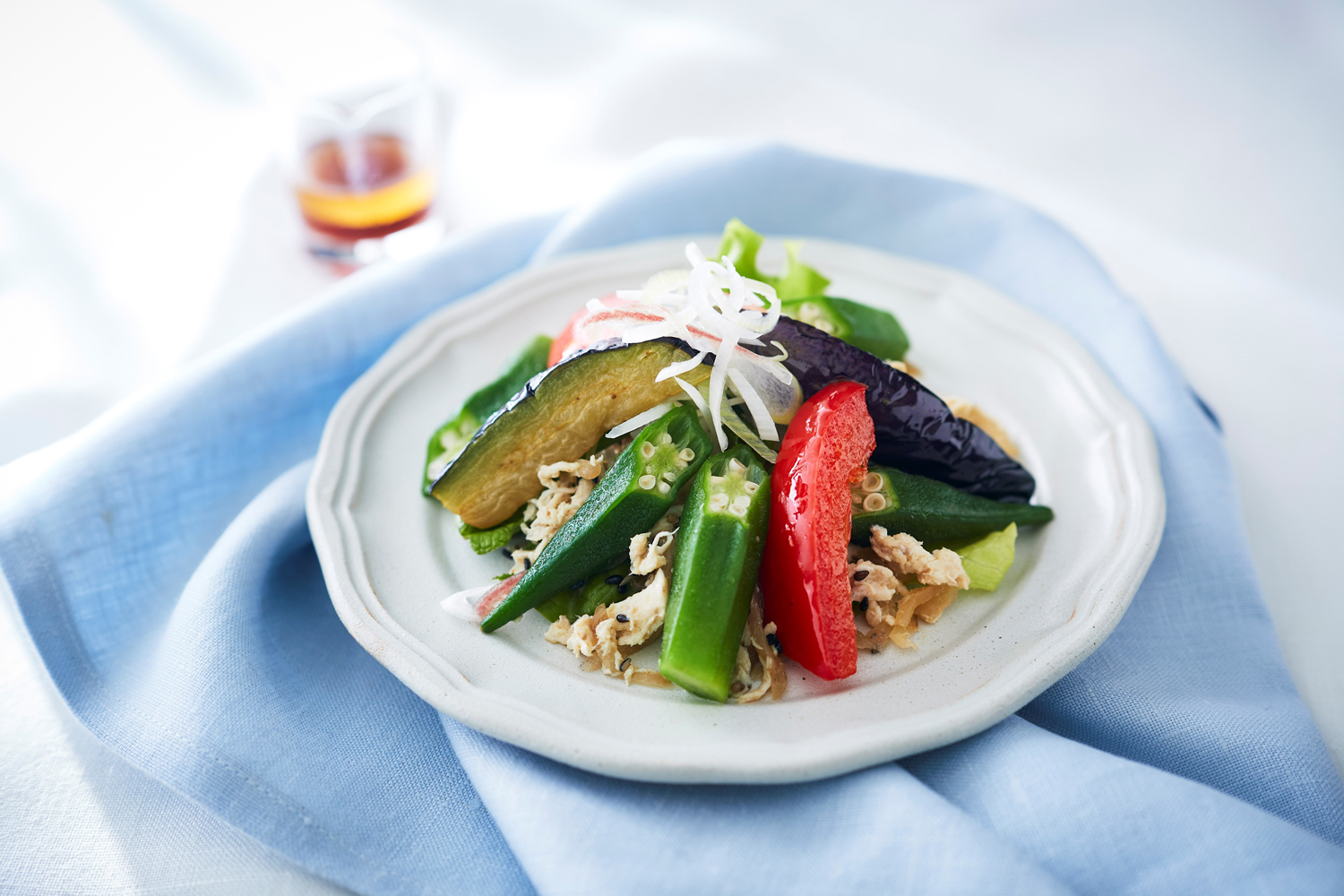 ザーサイとチキンの旨みと香味野菜がオクラと好相性。ドレッシングの胡麻油とねぎ油の風味が食欲をそそります。