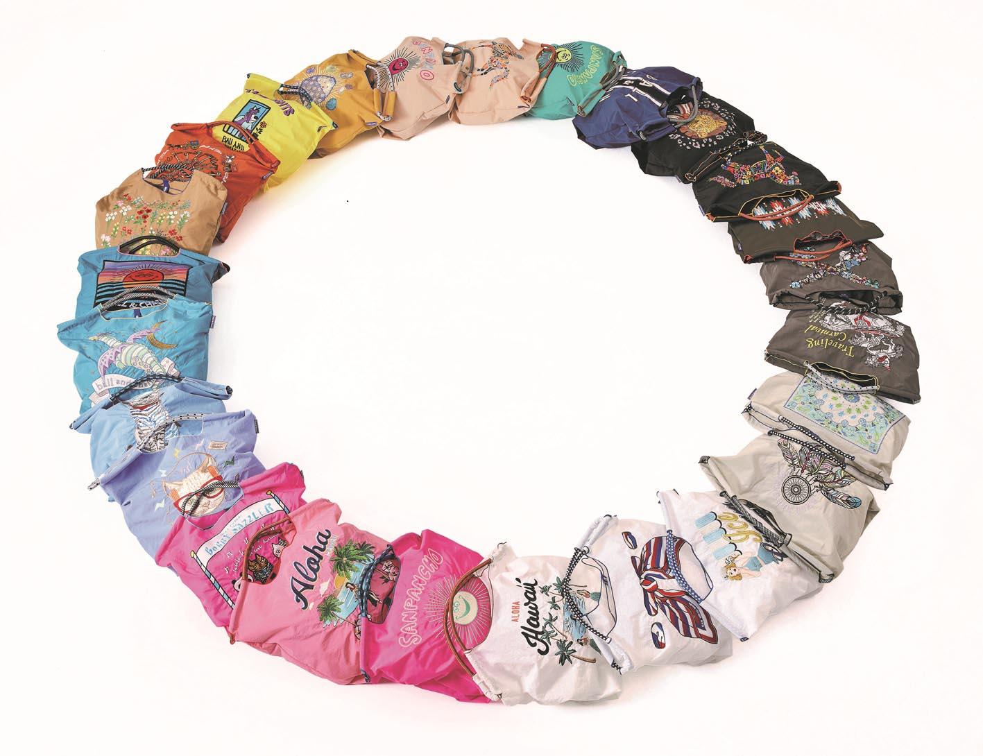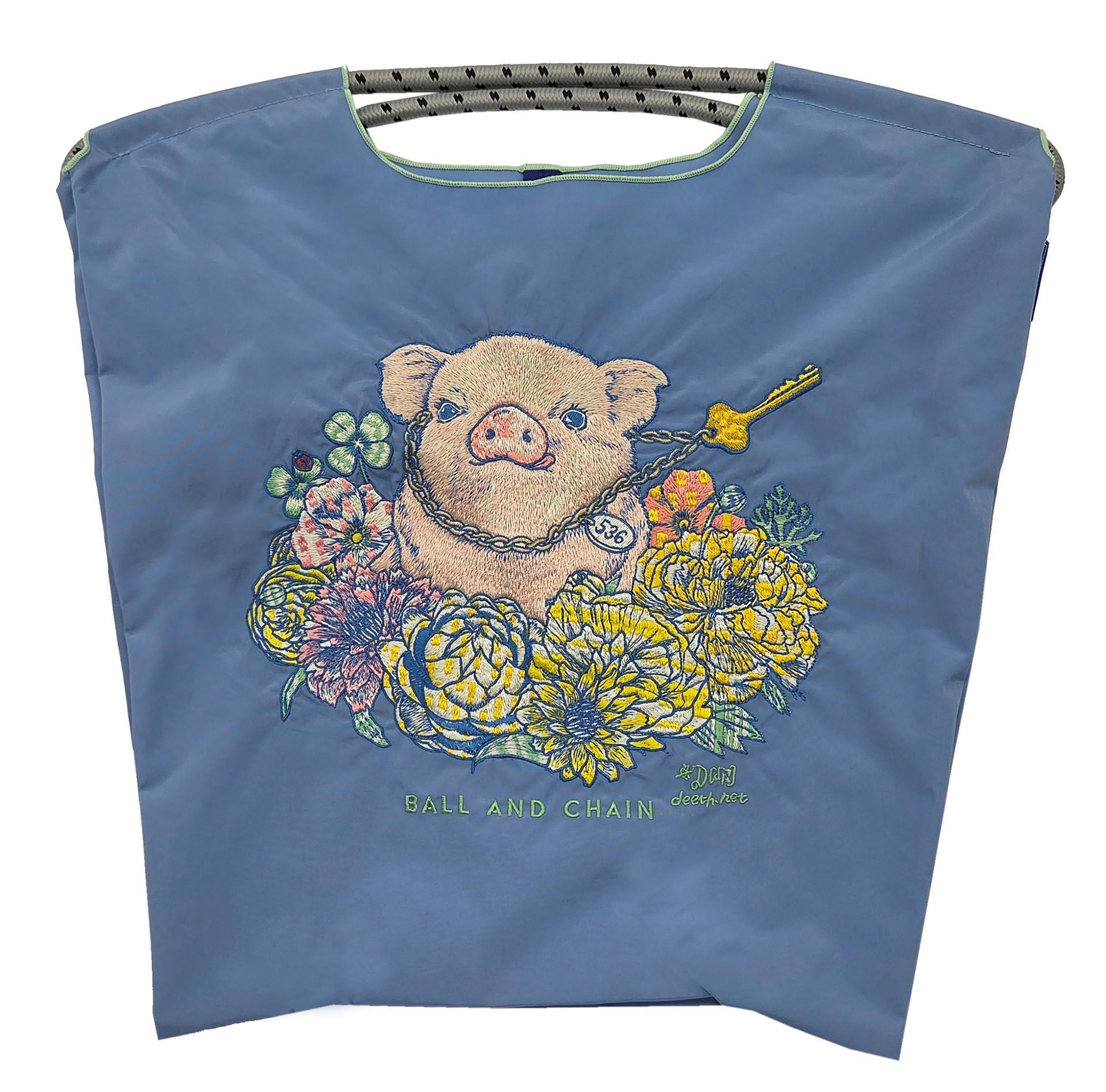 厚手の生地に刺繍でデザインを施したショッピングバッグは、耐久性にすぐれ、折りたたむとコンパクトになり持ち運びにも便利です。