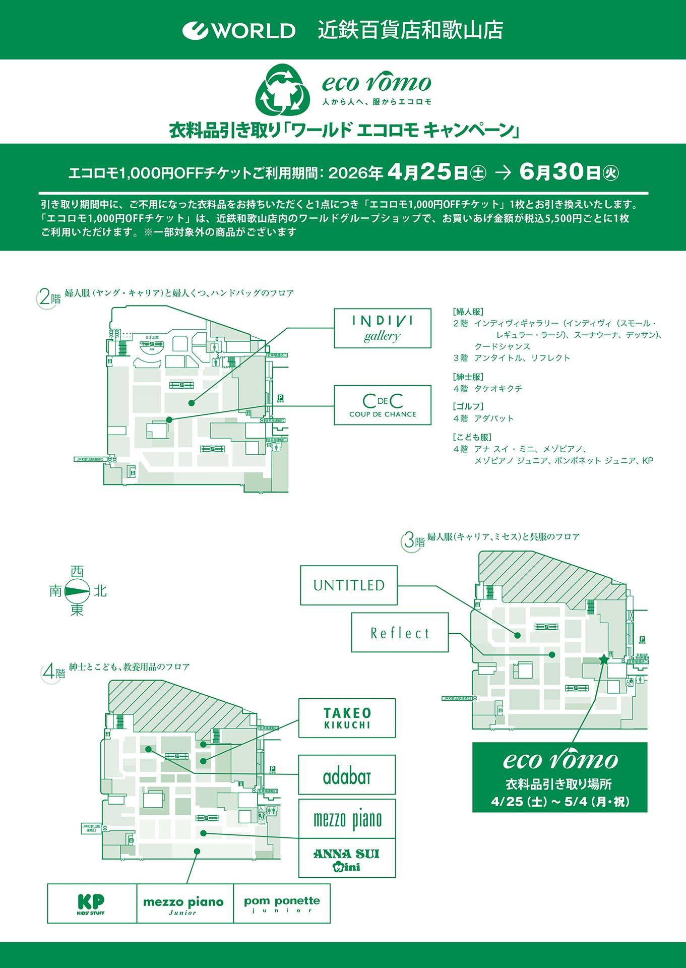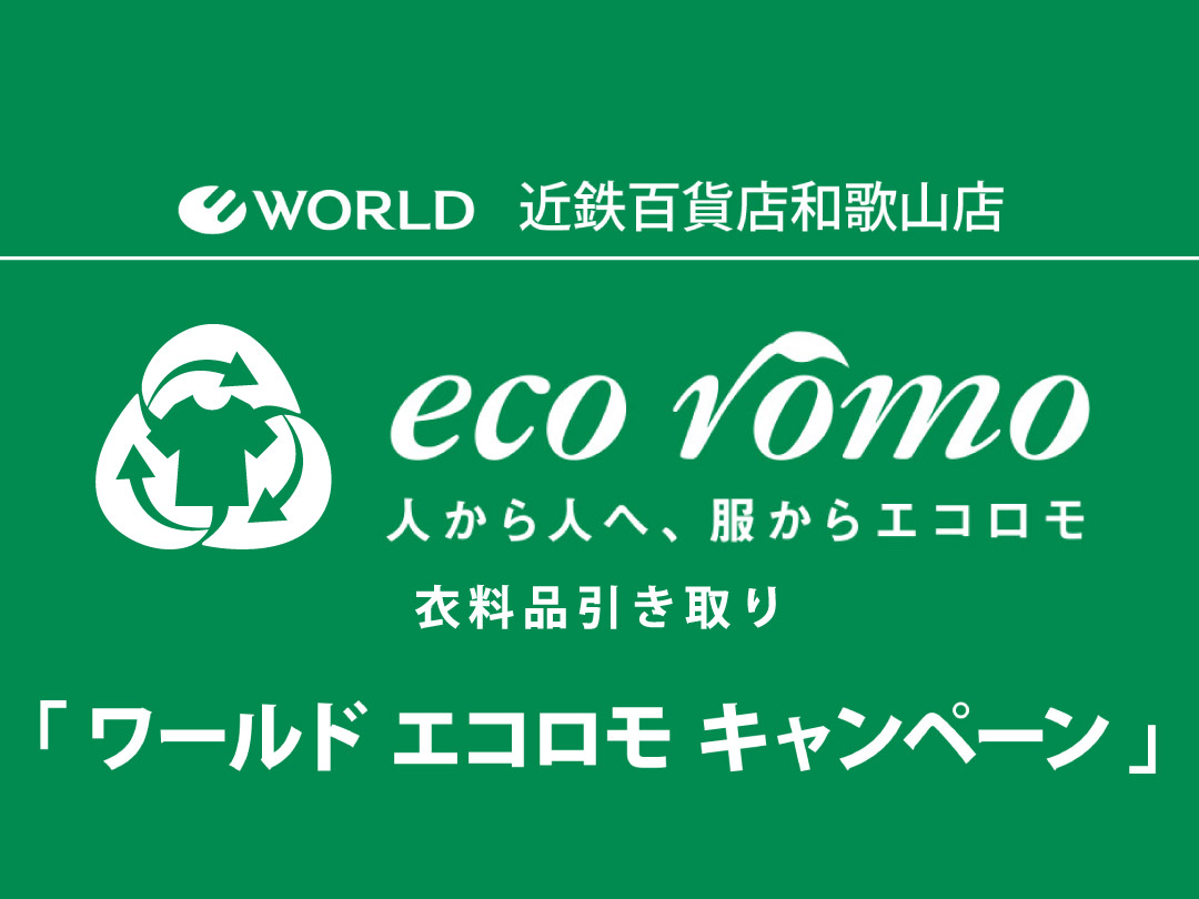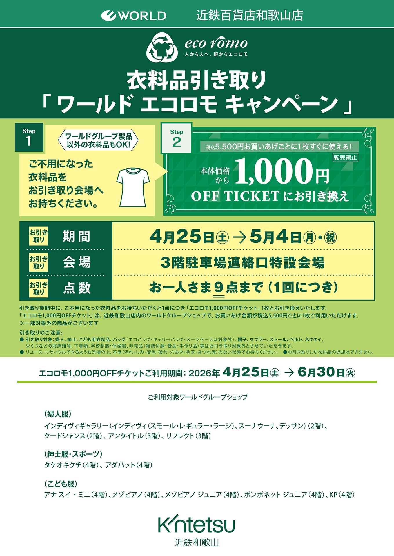 引き取り期間中に、ご不用になった衣料品をお持ちいただくと1点につき「エコロモ1,000円OFFチケット」1枚とお引き換えいたします。「エコロモ1,000円OFFチケット」は、近鉄和歌山店内のワールドショップで、お買いあげ金額が5,500円ごとに1枚ご利用いただけます。