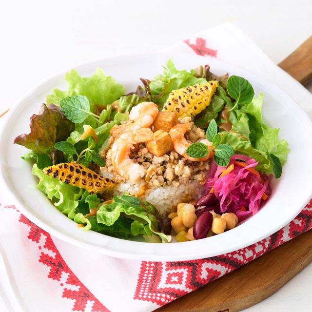 レモングラスや生姜、ナンプラーが香るピリ辛そぼろに海老、とうもろこし、厚揚げなどを合わせたエスニック風デリプレート。