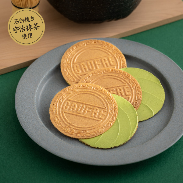 サクサクと香ばしい薄焼き生地に、通常より濃い抹茶のクリームをサンドしたプレミアムな抹茶ゴーフルです。