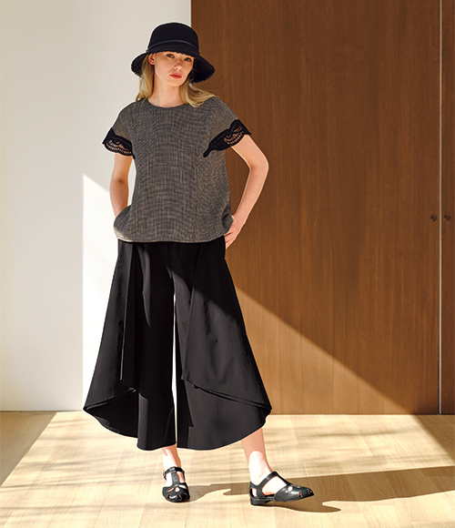 ツイードのようなドライでナチュラルな風合いが魅力のブラウスは、エッジの効いたブラックレースが映えて。