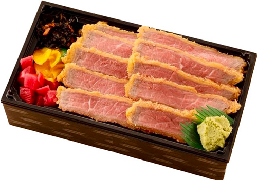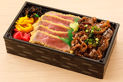 高温の油でサッと揚げた柔らかい牛かつと、お肉の旨味溢れる黒毛和牛のカルビ焼肉の両方が楽しめる贅沢なお弁当です。