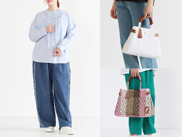 心地よい素材と軽やかなシルエットに、メキシコの伝統技法で編み上げたメルカドバッグを合わせ、装いにさりげない華やぎを添えます。