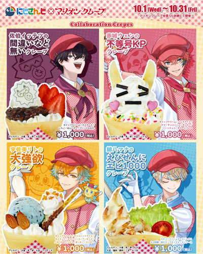 コラボ対象のマリオンクレープ全国55店舗にて「にじさんじ×マリオンクレープ」コラボの開催が決定いたしました!コラボ限定のクレープ店員衣装をまとったにじさんじ所属『オリエンス』の佐伯イッテツさん、赤城ウェンさん、宇佐美リトさん、緋八マナさんが登場!●開催期間:10/1(水)→31日(金)