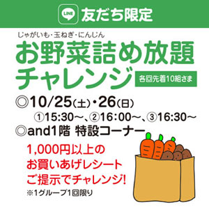●開催日:10/25(土)・26(日)●時間:①15:30~、②16:00~、③16:30~●場所:and1F特設コーナー●各回先着10組さまHoop・andの公式LINE画面と、Hoop・andで10/25(土)・26(日)にお買いあげの¥1,000以上のレシートをご提示ください。1グループ1回限りじゃがいも・玉ねぎ・にんじんの詰め放題にチャレンジしていただけます。LINEの友だち追加はコチラ
