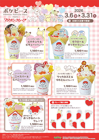 3/6(金)→31(火)の期間中、マリオンクレープにてポケピースデザインのクレープ5種類を販売いたします。ハートがたくさん散りばめられた可愛いデザインです。