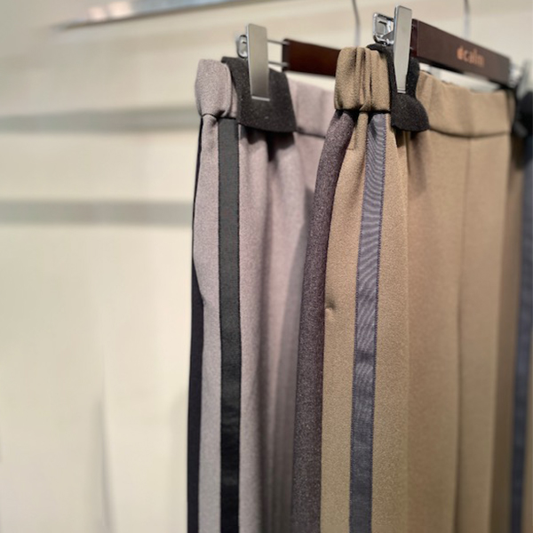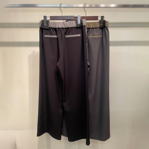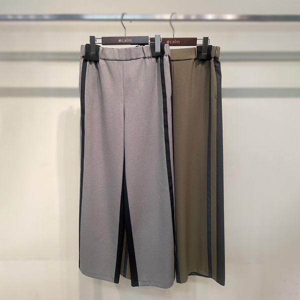 サイドに入ったラインやバイカラーがスポーティーな印象のワイドパンツ。シワになりにくいイージーケア素材で、シルエットもワイド過ぎず、ラインが入っている為よりすっきり見えします。