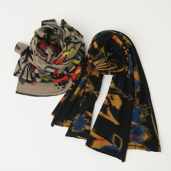 秋冬にも心おどるような、来る春を想起する柄をと、さまざまな花が咲く様子を描いたストール。カットジャガードという手法で表現した柄は、おぼろげな雰囲気が魅力です。