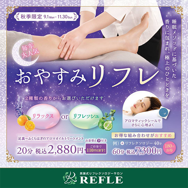 睡眠メソッドにもとづいたアロマオイルで、ふくらはぎから足裏のトリートメントを行います。アロマの香りは、リラックス系のラベンダー・リフレッシュ系のベルガモットの2種類からお選びいただけます。