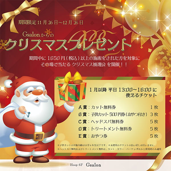 11/26(水)→12/26(金)の期間中、税込¥1,650以上の施術を受けていただいたお客さまへクリスマス抽選会を実施!!