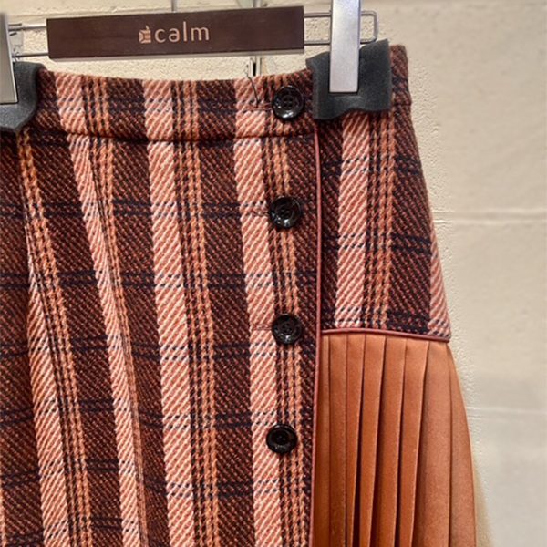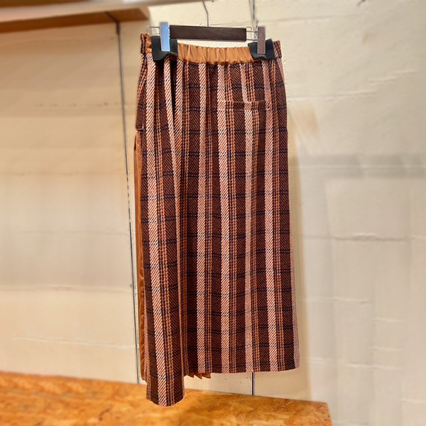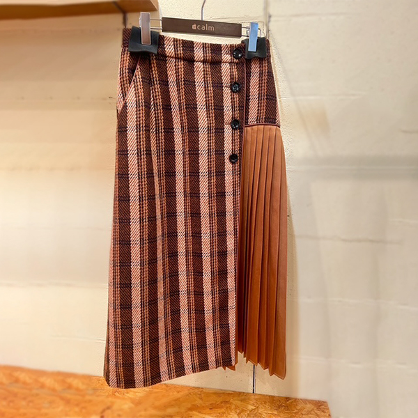 動くたびに揺れるプリーツとざっくり感があるチェック生地のコントラストが魅力のドッキングスカート。フィット&フレアのシルエットにスエード調のプリーツをあしらい、異素材とアシンメトリーなバランスが映える一着です。