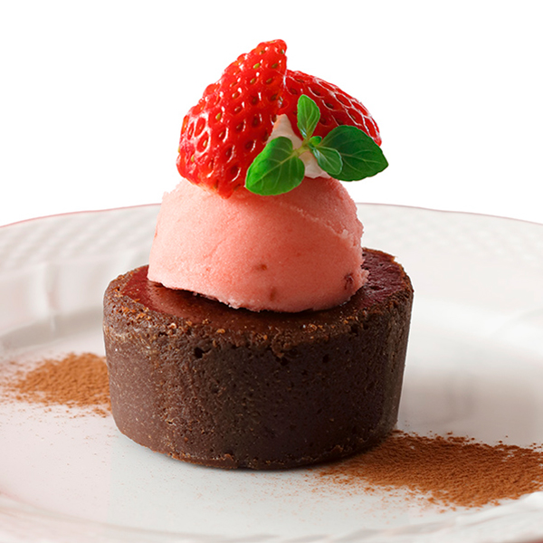珈琲にあうように作られたチョコケーキはしっとりとろけるガナッシュ入り。フランボワーズアイスを添えた期間限定スイーツです。