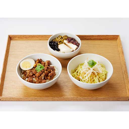 柔らかく煮込んだ豚肉がのったルーロー飯、ミニ豆花、選べる一品がセットになった台湾まるごとメニュー。選べる一品は、唐揚げ/エビチリ/肉団子/あえ麺からお好きな料理をお選びください。