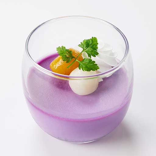 もちもち食感の芋もちと白玉、そしてなめらかな自家製紫いもプリン。濃厚なミルクが香る、贅沢な味わいをお楽しみください。