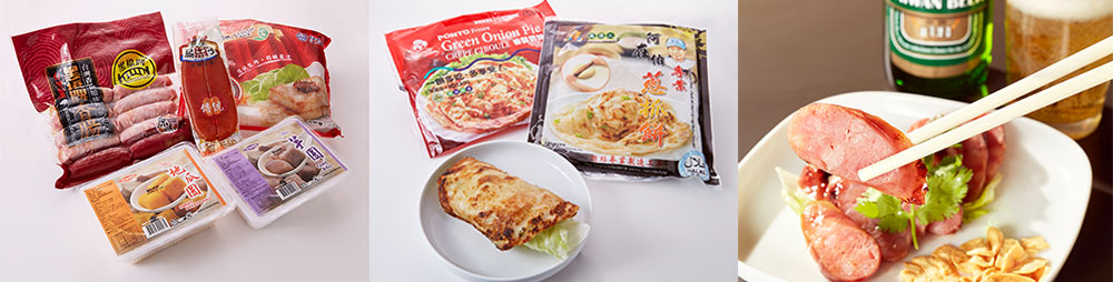 台湾旅行に欠かせない台湾屋台グルメの葱パイ、台湾ソーセージ、大根餅、魚包蛋、ロブスター団子、芋モチ、イカ団子などバラエティ豊かに取り揃えています。