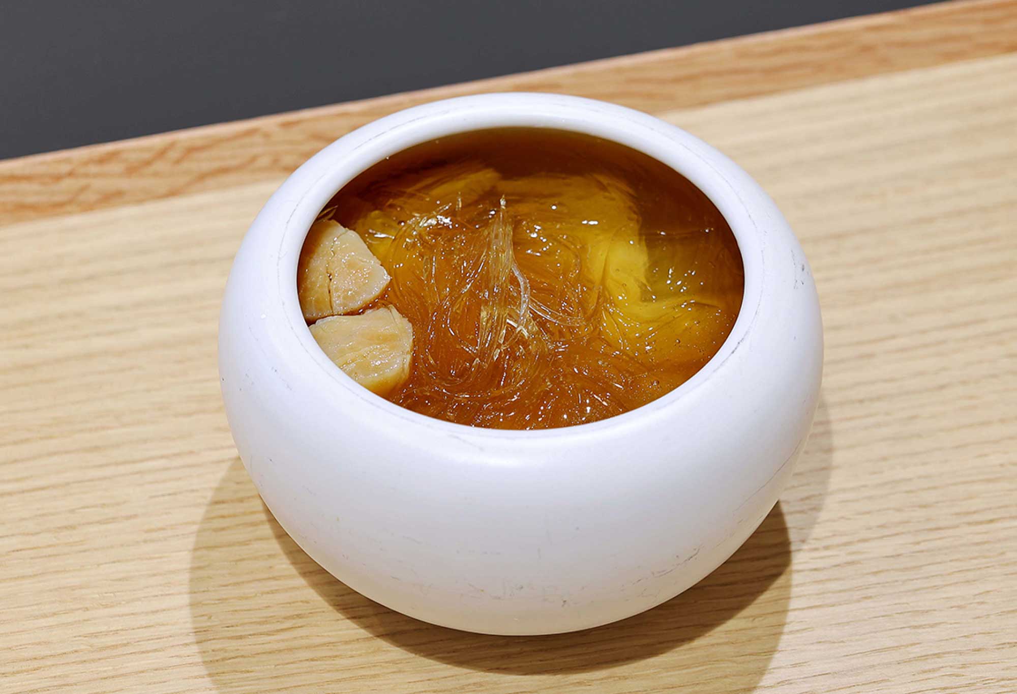 琥珀色の透き通った壺蒸しスープに、フカヒレ・干し貝柱などの高級食材をはじめ、白きくらげ・豚肉・揚げうずら卵・長芋など10種類の食材を合せ、時間をかけて蒸し煮した料理。