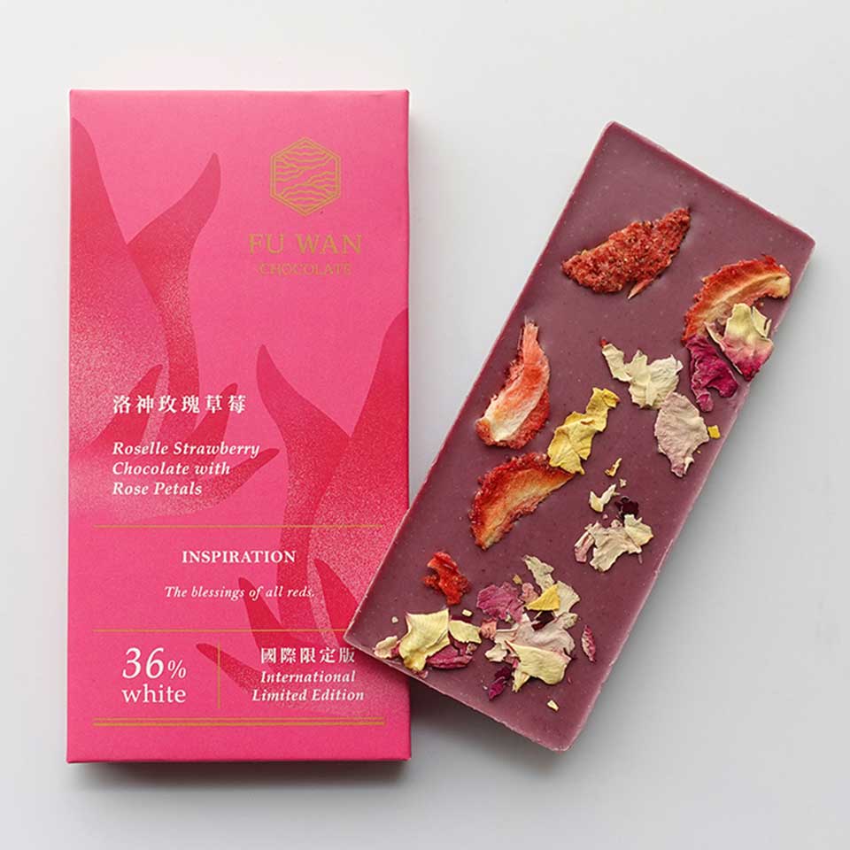 台湾の名産品であるローゼル、ストロベリーなどを使ったホワイトチョコレートベースの甘酸っぱい風味のチョコレート。トッピングのイチゴやバラが美しい一品です。