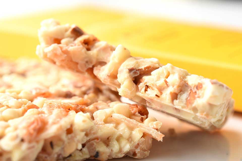 フーワンチョコレートの地元、台湾「東港(ドンガン)」の名産でもあるサクラエビとアーモンドを使ったユニークな板チョコレートで、地元でも大変人気です。