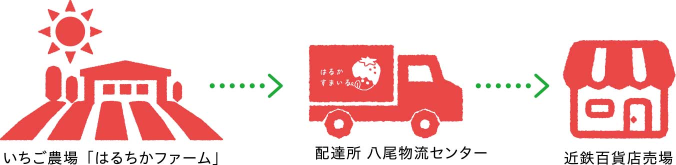 近鉄グループの物流網により、農園から百貨店の売場へ直送する物流スキームを実現。これにより、おいしくて新鮮ないちごを各店に配送、お客さまのもとへお届けすることが可能となりました。