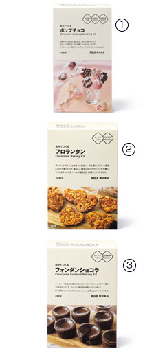 こんにちは、無印良品です。 ①「自分でつくる ポップチョコ」1,200円 ②「自分でつくる フロランタン」1,200円 ③「自分でつくる フォンダンショコラ」1,200円 このほかにもタルトやマフィン、ガトーショコラなど様々なお菓子が手軽に作れるキットがございます。ぜひ、店頭にてお買い求めください。 |