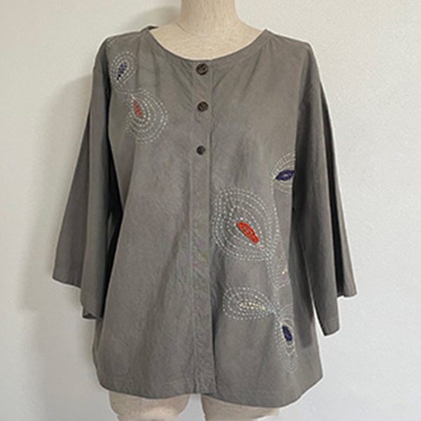 矢車で染めたカーディガンです。飾りに刺し子を施しています。 |