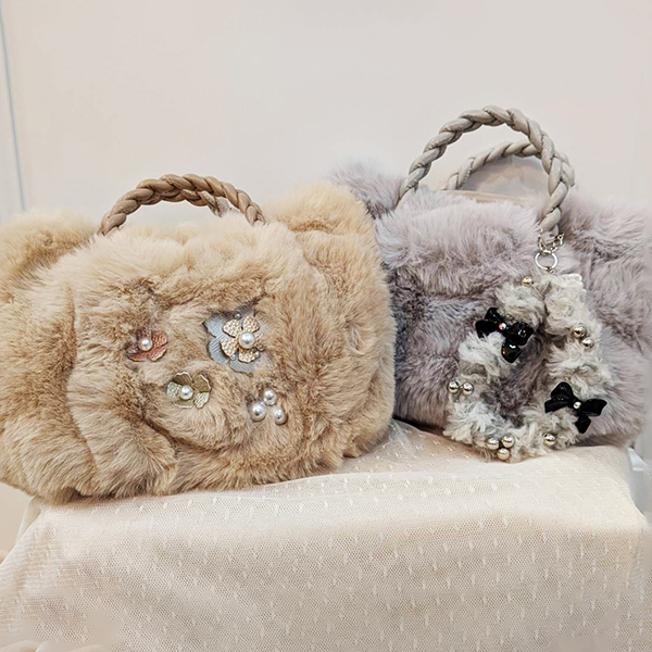 オリジナルのお花モチーフやふわふわチャームなどがついた2wayファーバッグです。 |