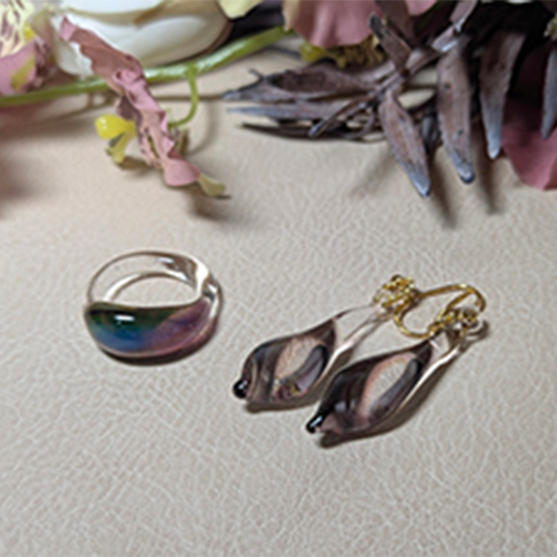 【光+色の変化】を大切に、高温の炎でボロシリケイトガラス(耐熱ガラス)を溶かし、ひとつひとつ丁寧に制作したアクセサリーです。 |