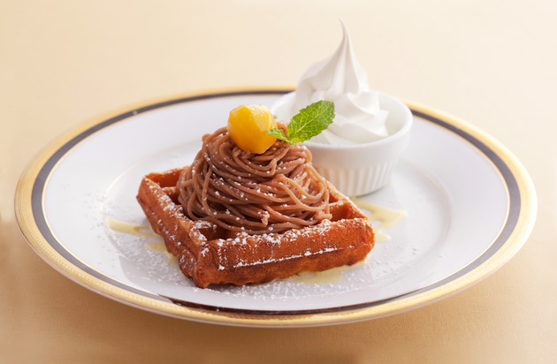 | 当店手作りのワッフルに、秋おすすめ「モンブランワッフル」が登場。ほんのり甘い栗ペーストとホイップのハーモニーをご賞味くださいませ。 |