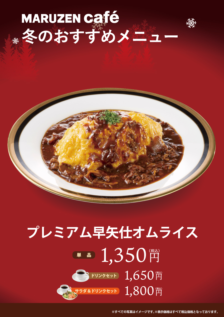 | マルゼンカフェー番人気のふわとろオムライスに、お肉たっぷりのプレミアム早矢仕ソースをかけたこの時期だけの限定メニューです。ぜひ、この機会にお召し上がりくださいませ。 |
