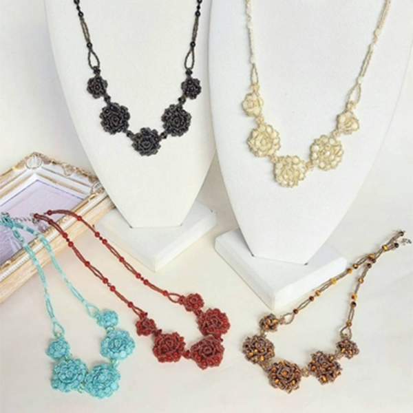 「つくって・つけて・ほめられて」をモットーに色々なビーズを使い色の美しさ、素材合わせの楽しさを感じていただければと思います。天然石にビーズを施してバラの花のように仕上げています。 |