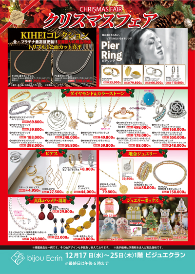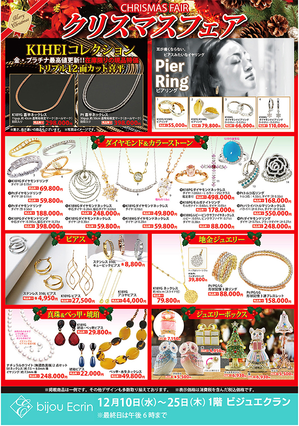 この度ビジュエクランではクリスマスフェアを開催いたします。1年で一番ワクワクするこのシーズン。大切な方やご自身のご褒美として、心を込めて贈るクリスマスギフトにふさわしいジュエリーをご用意いたしました。人気の喜平ジュエリーをはじめ、ピアス、イヤリングやダイヤモンド・カラーストーン・真珠など数々のジュエリーを特別価格で多数ご用意いたしました。この機会にぜひお立ち寄りくださいませ。