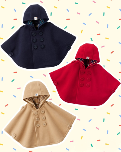 前開きのホックで着脱が簡単で、袖口のボタンを留めると袖を通せて動きやすいデザインに。ダッフルコートとお揃いコーデがおすすめです☆ |