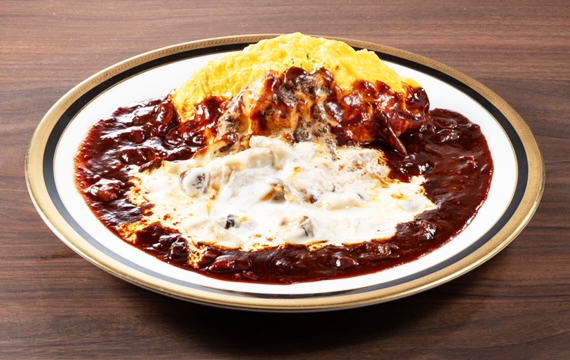| 人気の早矢仕オムライスに、ホワイトソースときのこをトッピングしました。ぜひこの機会にお召し上がりくださいませ。 |