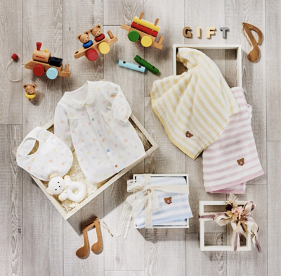 ミキハウスでは、スタイやタオル、ベビーウエアなどいくつあってもうれしいギフトアイテムがたくさん♪