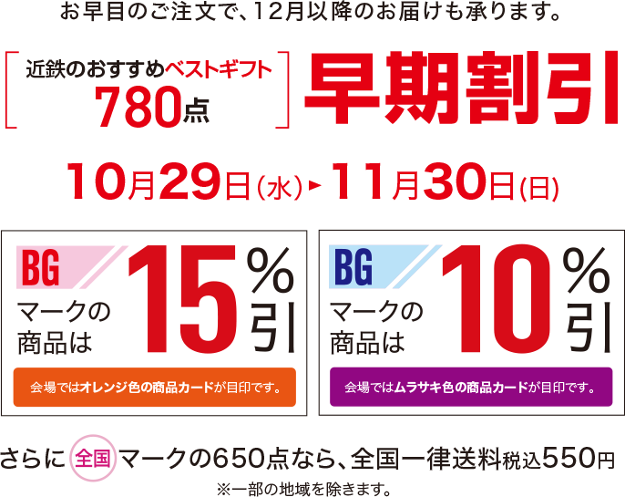 会場では「赤いBGマーク」(オレンジ色の商品カード)と「青いBGマーク」(ムラサキ色の商品カード)の商品をともに10%引でご案内しています。